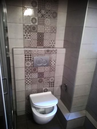 Σύμφωνα με τις προτιμήσεις του πελάτη μας τοποθετήσαμε εντοιχισμένο καζανάκι με κρεμαστή λεκάνη και προχωρήσαμε σε ηλεκτρολογικές μετατροπές που μας επέτρεψαν νέες παροχές φωτισμού αλλά και πρίζες για το πλυντήριο και το έπιπλο του μπάνιου.