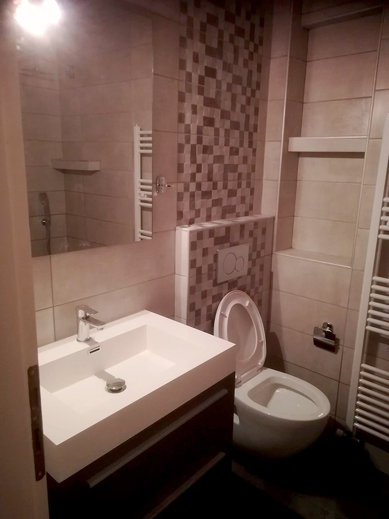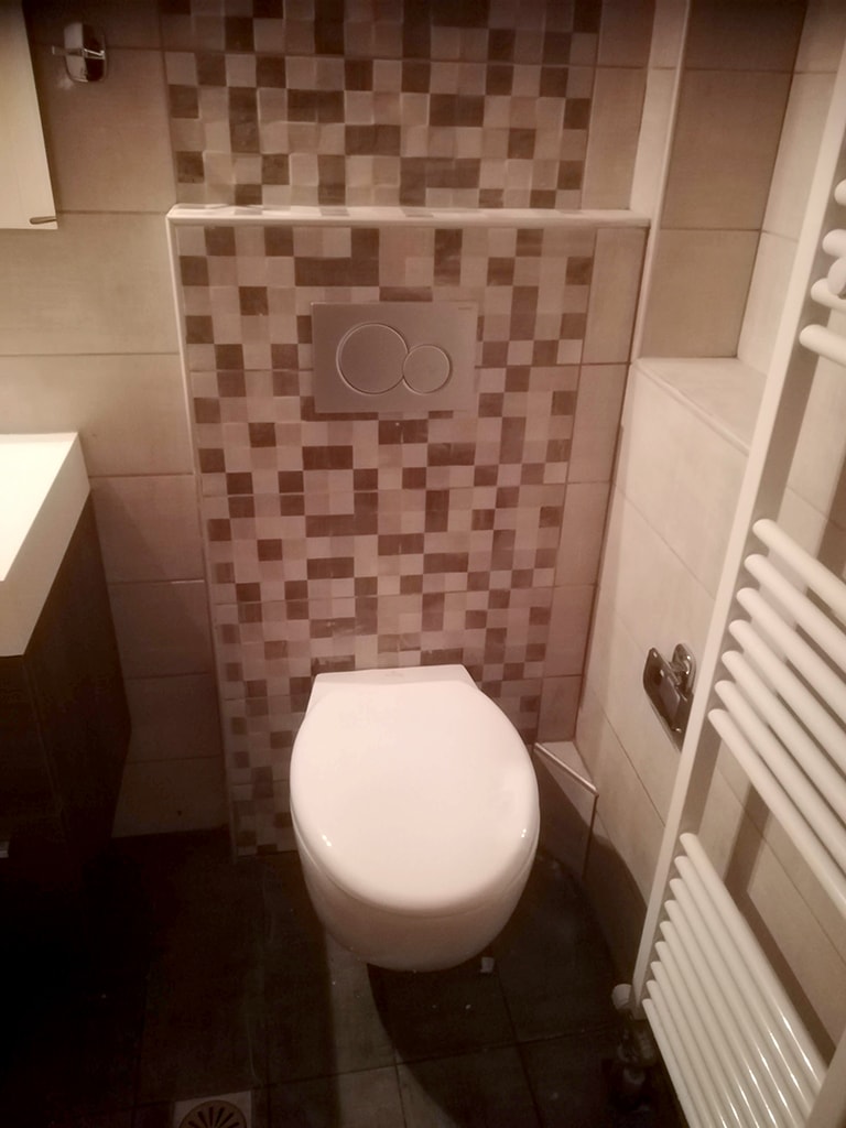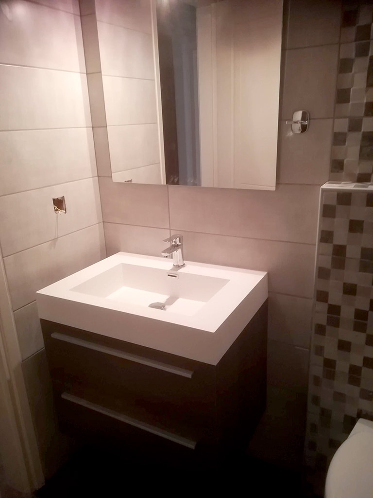 Η εργασία που κάνει τη διαφορά σε αυτό το χώρο είναι πως έγινε ανακατάταξη ώστε να αξιοποιηθεί στο μέγιστο κάθε ελεύθερη επιφάνεια. Κατασκευάστηκε αποθηκευτικός χώρος στον τοίχο, παράλληλα με μια τεχνική πλακιδίων που ανεβάζει την ποιότητα της αισθητικής του χώρου. Προτιμήσαμε να τοποθετήσουμε κρεμαστή λεκάνη που δίνει μια αίσθηση μινιμαλισμού, κάτι που επιλέγεται συνήθως για μικρούς χώρους. Επιπλέον, εγκαταστάθηκε χτιστή ντουζιέρα που δεν πιάνει πολύ χώρο, αλλά προσφέρει μια άνετη εμπειρία καθαριότητας.