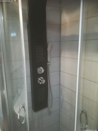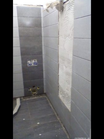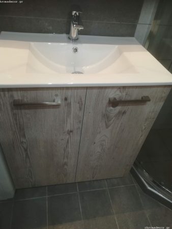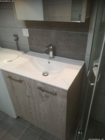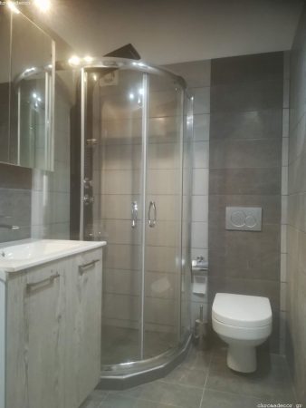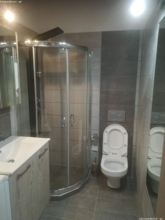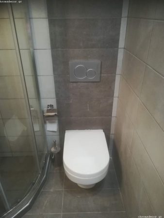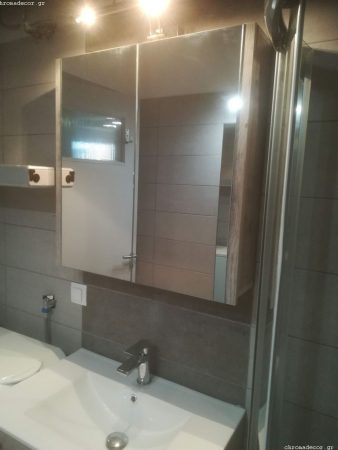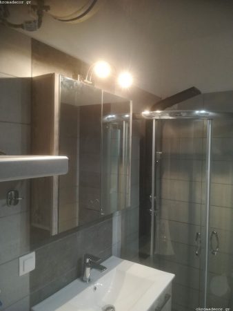 Τα παλιά πλακάκια και είδη υγιεινής αποξηλώθηκαν και αντικαταστάθηκαν με νέα, σύγχρονου και κομψού σχεδιασμού. Τοποθετήσαμε εντοιχισμένο καζανάκι με κρεμαστή λεκάνη ώστε να εξοικονομηθεί χώρος. Επιπλέον, ανανεώσαμε το χρώμα στο ταβάνι του μπάνιου για ένα ομοιόμορφο, φρέσκο αποτέλεσμα. Εγκαταστήσαμε χτιστή οβάλ ντουζιέρα με καμπίνα 80×80 εκ. με στήλη αντί απλής μπαταρίας μπάνιου. Ο πελάτης μας προτίμησε να τοποθετηθεί κρεμαστό έπιπλο μπάνιου με επικαθήμενο νιπτήρα και μονοκόμματο κρεμαστό ντουλάπι με καθρέπτη στα πορτάκια.