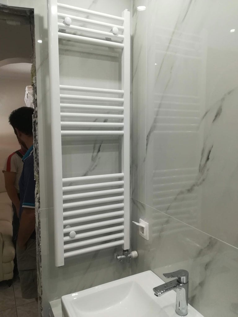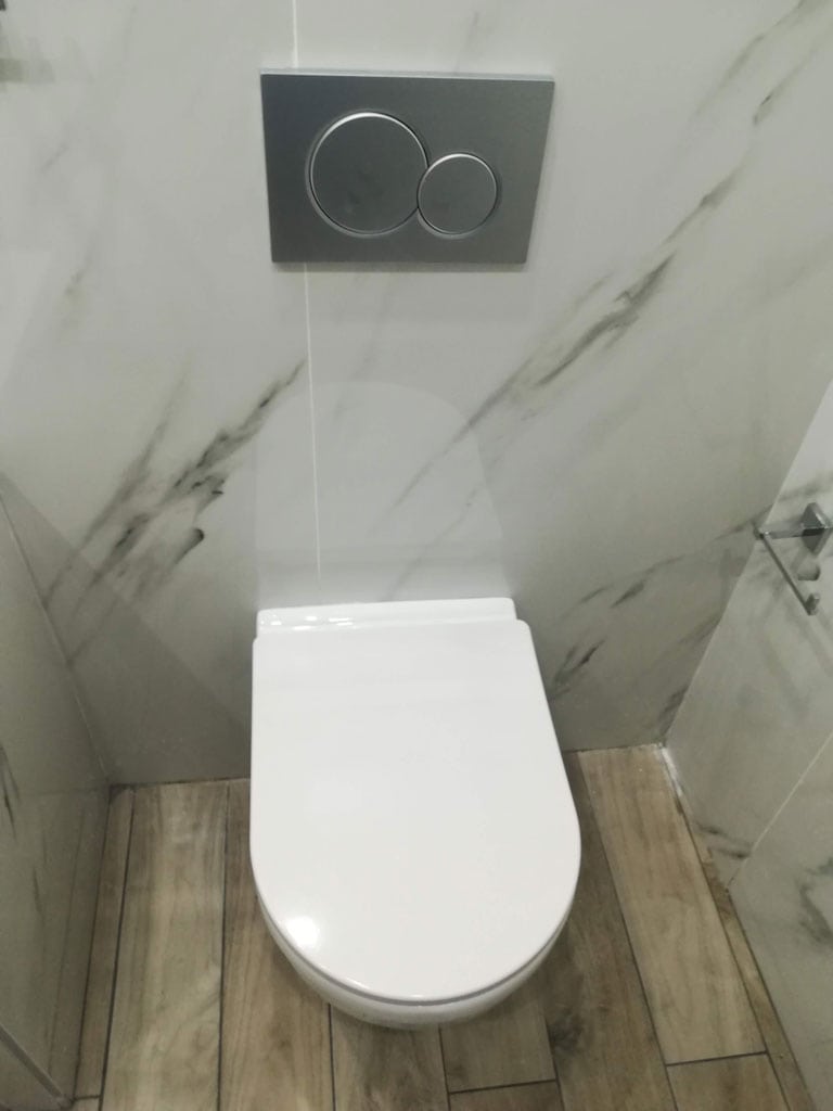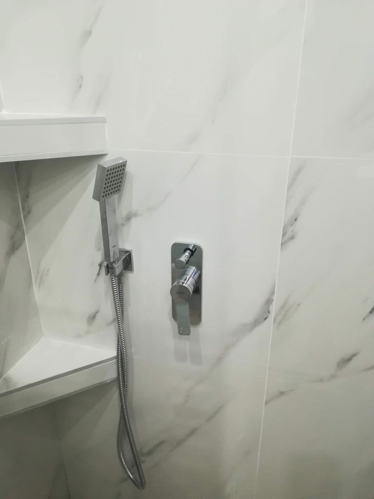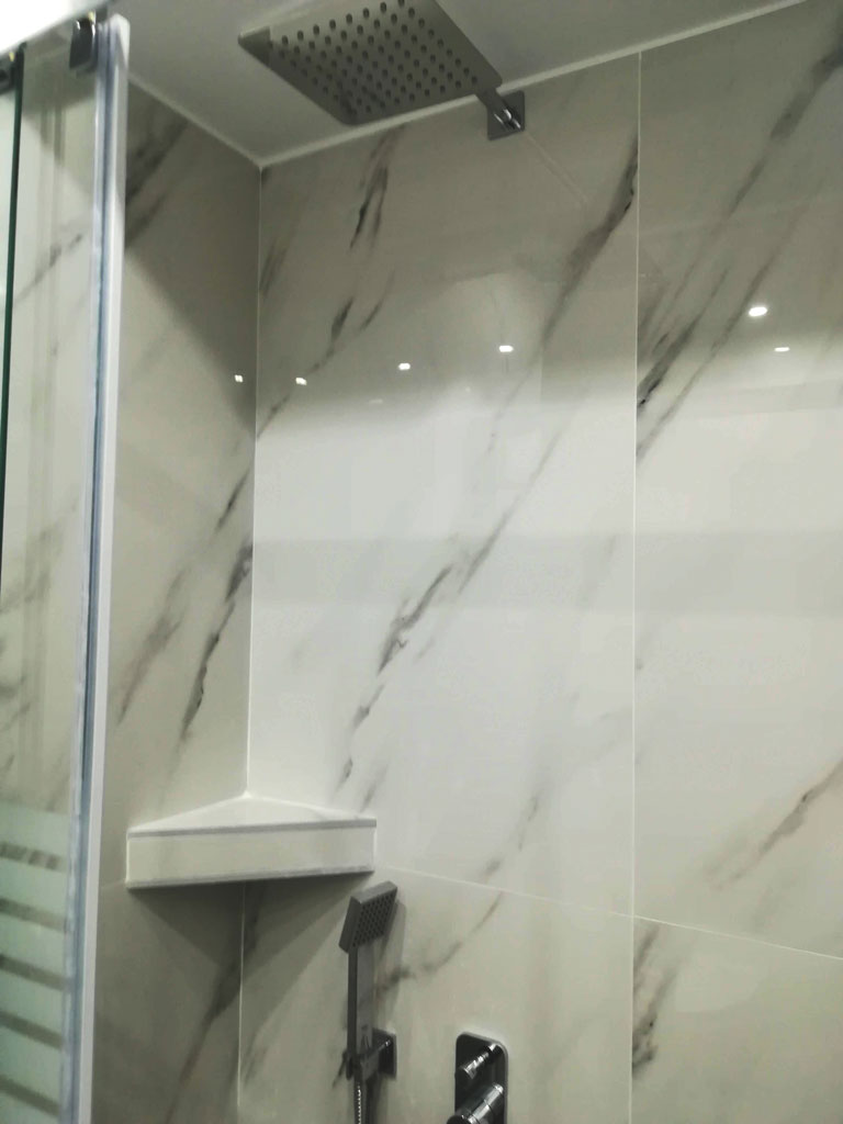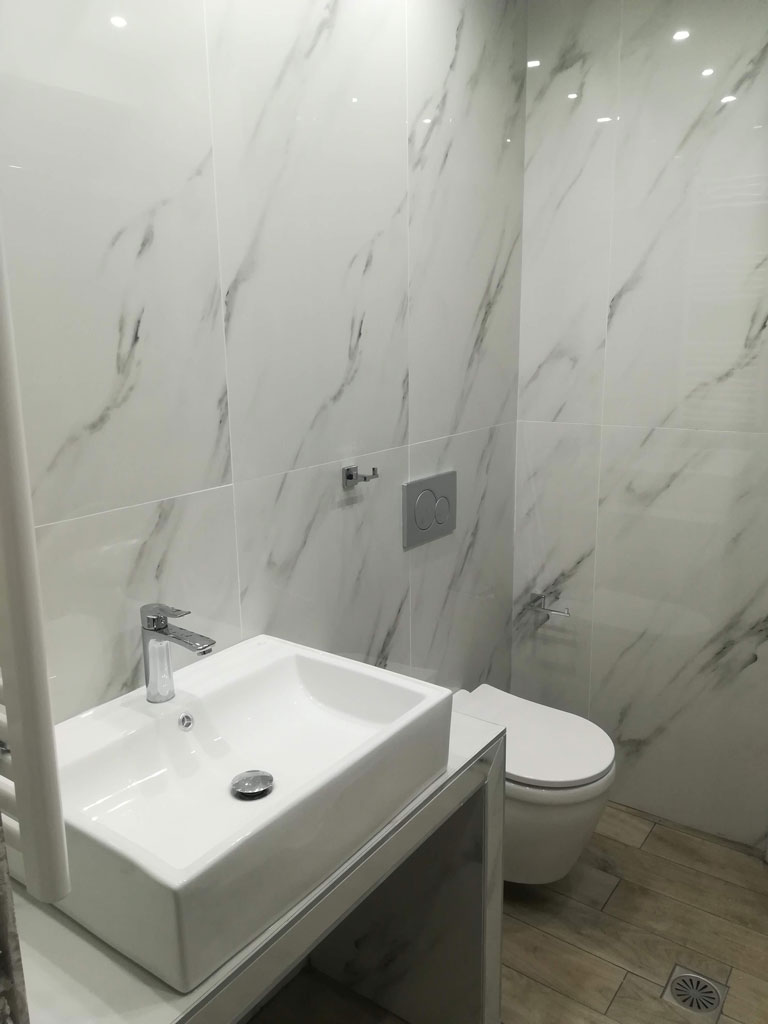 - Τοποθέτηση πλακιδίων μεγάλων διαστάσεων τύπου μάρμαρο στους τοίχους και τύπου ξύλου στο δάπεδο