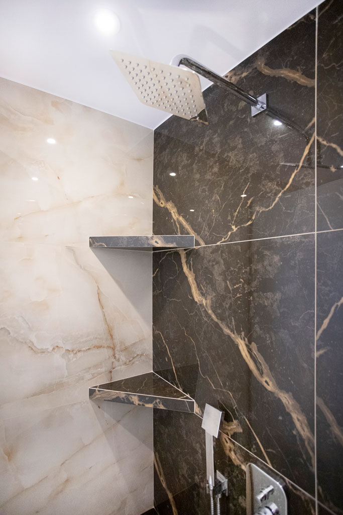 ✔️ Χτιστεί ντουζιέρα με πλακάκια τύπου μαρμάρου σε γήινες αποχρώσεις