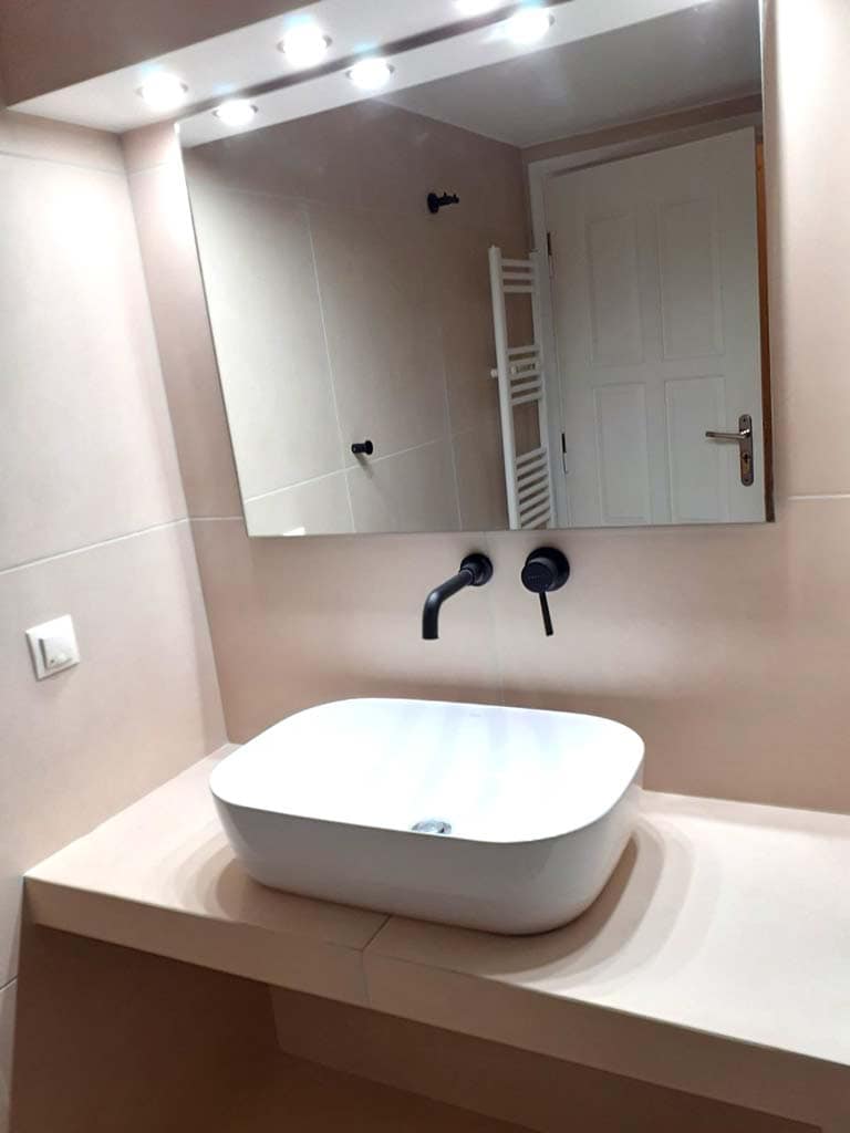Επιπλέον, ο νέος καθρέπτης και τα δυνατά φώτα που τοποθετήθηκαν από πάνω ενισχύουν τη συνολική αισθητική του χώρου, με αποτέλεσμα να φαίνεται πιο φωτεινό το μπάνιο, καθαρό και περιποιημένο, χωρίς να βαραίνει η ατμόσφαιρα ή να είναι δυσάρεστο. Η κατασκευή πάγκου για την εγκατάσταση του νιπτήρα δημιούργησε επιπλέον χώρο από κάτω για τη τοποθέτηση πλυντηρίου ή ντουλαπιών για να αποθηκευτούν διάφορα αντικείμενα. Η αποστολή μας ήταν άκρως επιτυχημένη καθώς μεταμορφώσαμε ένα κλασικό μπάνιο σε ένα κομψό, φινετσάτο, και πολυτελές δωμάτιο όπου η εμπειρία γίνεται απόλαυση.