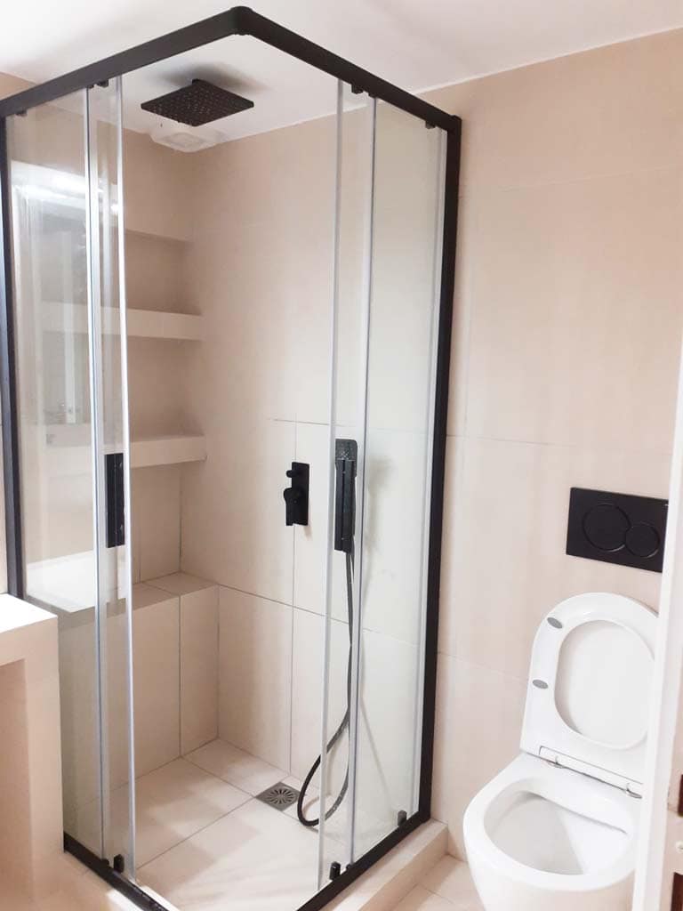 Στο κλασικό αυτό μπάνιο στο Ίλιον, η εταιρία μας προχώρησε σε ολική ανακαίνιση μπάνιου, δίνοντας μοντέρνα και κομψή αισθητική. Προτιμήθηκαν χρώματα σε ήπιους τόνους στα πλακάκια και τα είδη υγιεινής, σε απλές, μαλακές γραμμές, ενώ τονίστηκε η αντίθεση με στοιχεία μαύρου χρώματος. Οι μαύρες λεπτομέρειες είναι πολύ δημοφιλείς στη διακόσμηση του μπάνιου, πετυχαίνουν αντιθέσεις σε συνδυασμό με ήπια χρώματα, χωρίς να δημιουργούνται ανεπιθύμητες εντάσεις. Η μπανιέρα αντικαταστάθηκε με μια υπερσύγχρονη ντουζιέρα που επιτρέπει την βέλτιστη αξιοποίηση του χώρου και τοποθετήθηκαν ράφια για να αποθηκεύονται τα προϊόντα περιποίησης, αφρόλουτρα και σαμπουάν χωρίς να φαίνονται άκομψα στο χώρο.